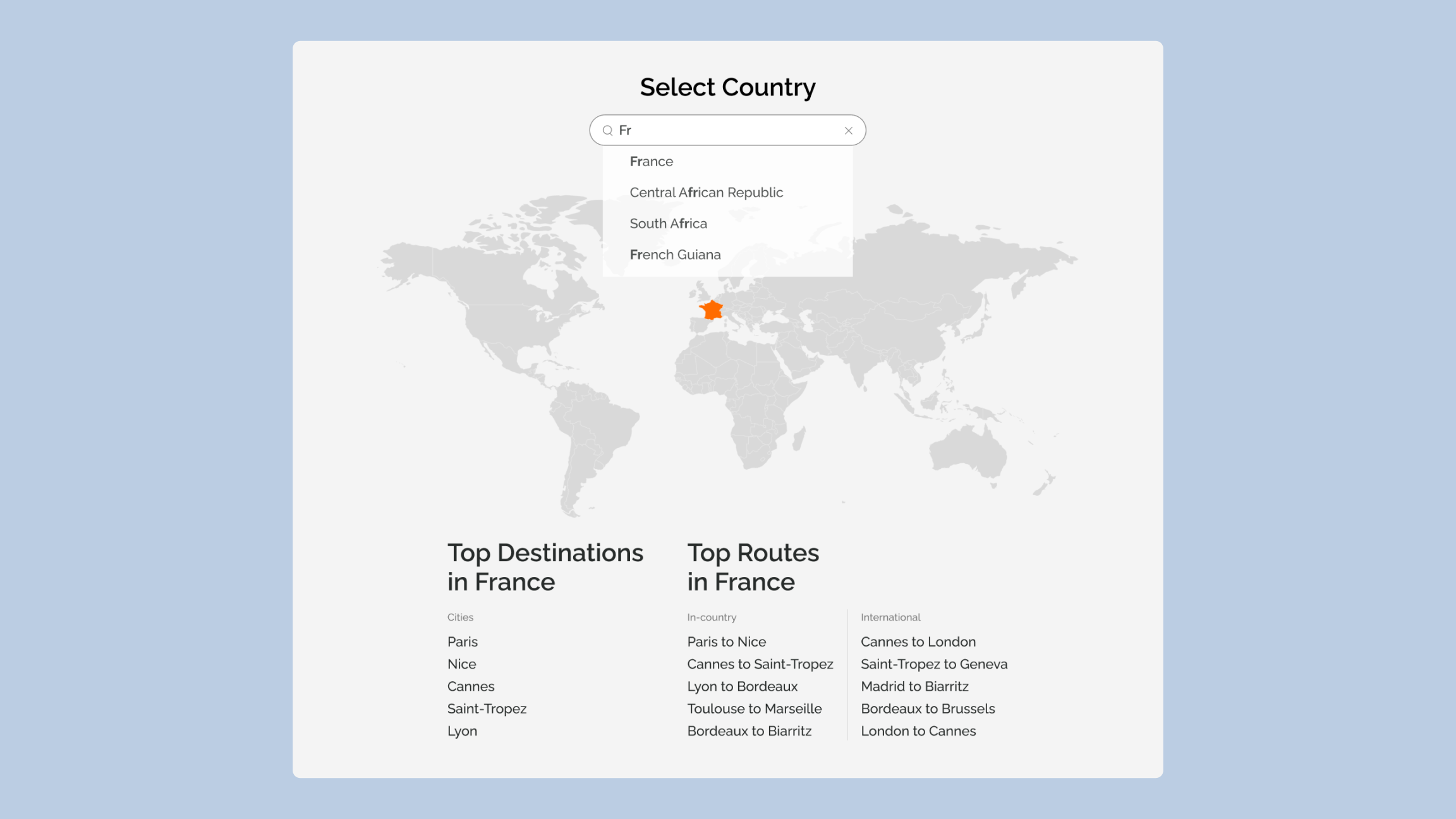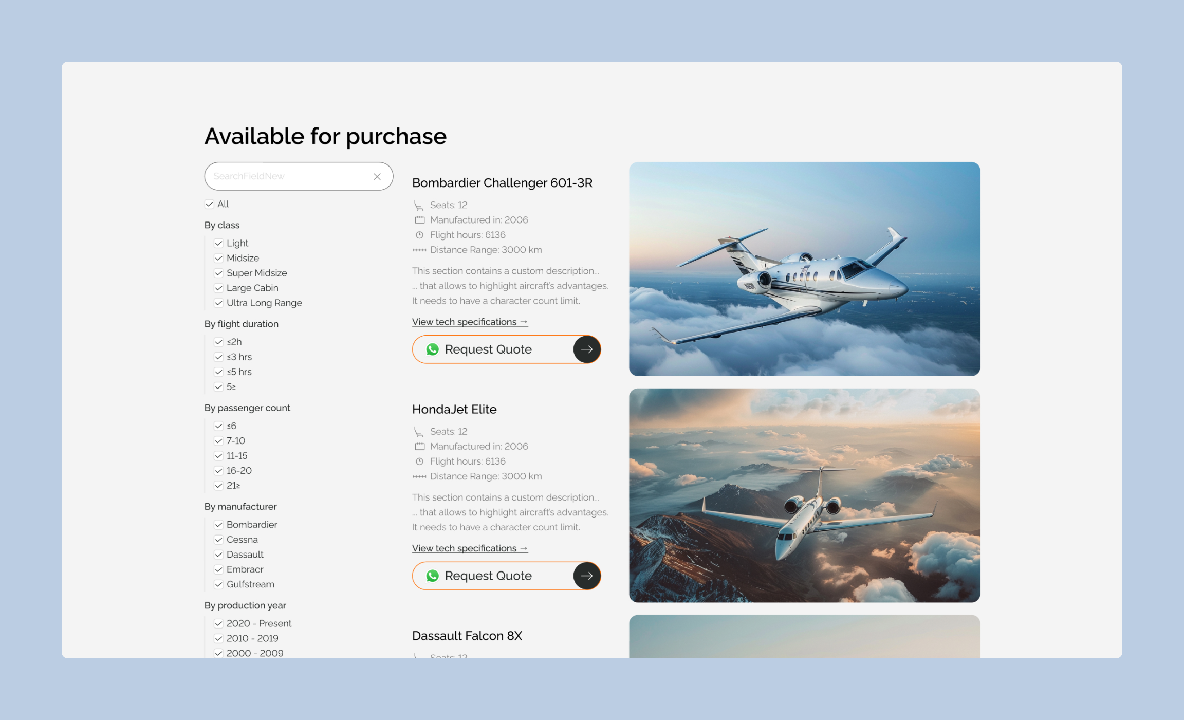 I designed complete search and action logic for all the three business directions: 1) charter bookings (primary focus)2) buy/sell private jets catalogue with filtering and specification pages, 3) luxury add-ons (transfers, hotels, yacht/chalet booking via personal managers).