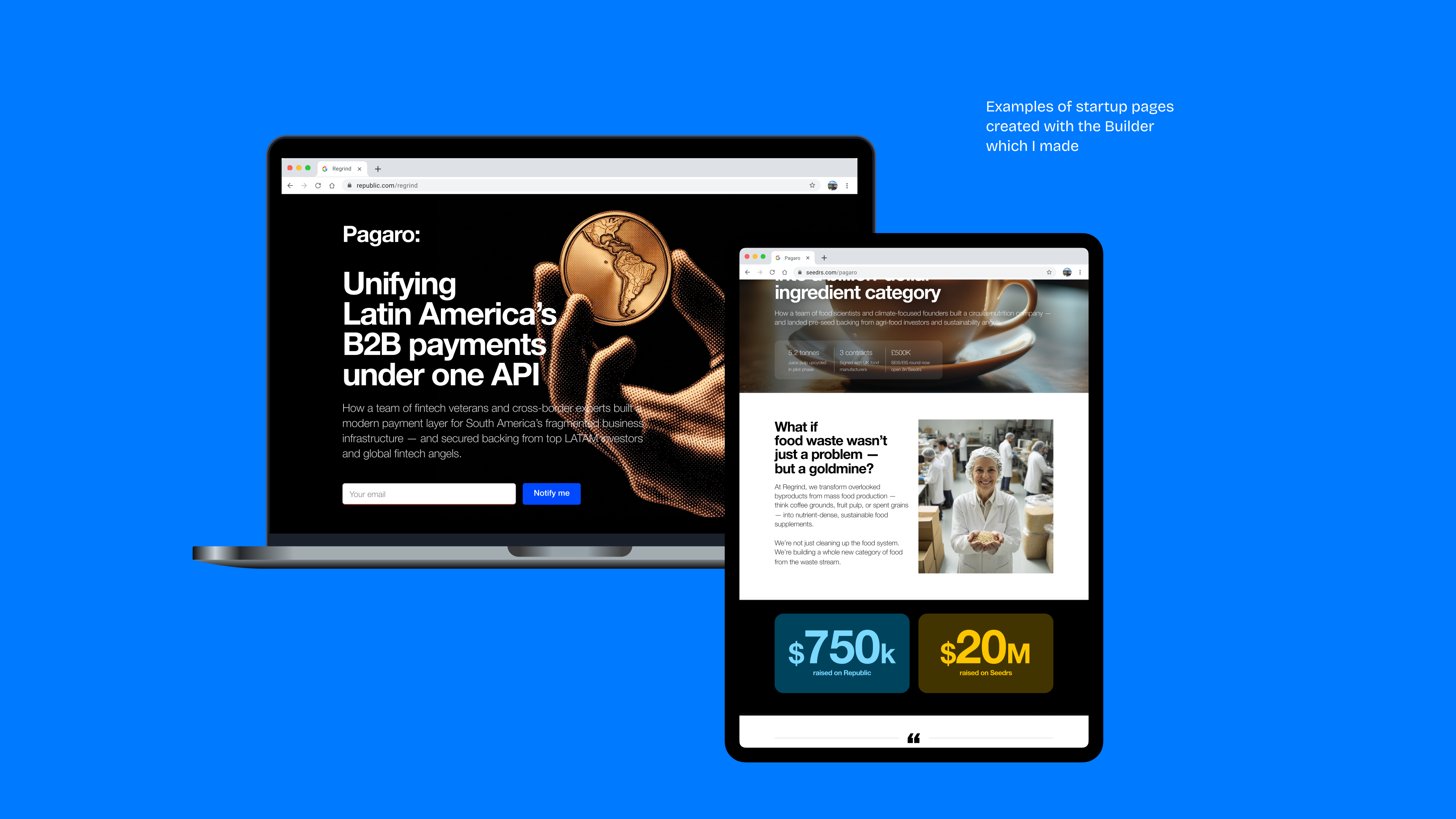 Republic is a large crowdfunding platform with numerous featured startups. I designed an internal tool that helped project managers create startup pages independently, bypassing designers and developers. The tool adoption allowed to speed up the rollout from 5 days to 1 day, improving overall productivity and allowing designers and devs to focus on strategic work instead of manual.